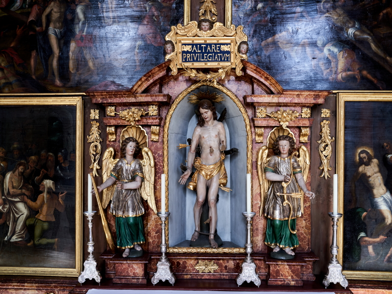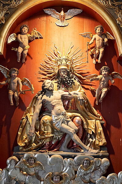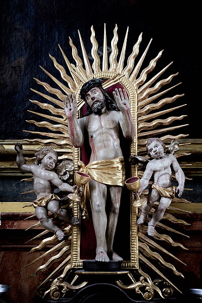 Eine Wallfahrtskirche als Tor zur Stadt, so zeigt sich Heilig Blut dem vom Süden kommenden Besucher Rosenheims. Nur wenige haben die Muse zur Besichtigung. Doch die Kirche mit der Brunnenkapelle ist es wert. Auf dem ehemaligen Wasen, so heißt die Landschaft vor der Stadt, wo sich Inn und Kalten einst trennten, wurde um 1500 an der Weissenhub eine hölzerne Kapelle für eine Schmerzensmann-Figur errichtet. Sie steht heute auf dem linken Seitenaltar. Schon bald entwickelte sich ein reger Wallfahrtsbetrieb zum Heiligen Blut. Eine größere Kapelle - ein gotischer Steinbau- sollte den Bedürfnissen gerecht werden. Hundert Jahre später wurde die Kapelle um ein geräumiges Langhaus nach Westen erweitert. Der Gnadenstuhl aus der alten Kapelle - ein Werk des Meisters von Rabenden- wurde in den Hochaltar des neu geschaffenen Chores integriert. Bei der von 1686 - 90 durchgeführten Renovierung im barocken Stil nimmt ein großformatiges Epitaph über die sieben Blutvergießungen Christi zusammen mit dem Sebastiansaltar fast die gesamte Nordwand des Langhauses ein. Er wurde der Pestbruderschaft gewidmet. Des Weiteren konnte der Hausstätter Baumeister Hans Mayr mit Giulio de Christophoris für die Gestaltung des Innenraumes einen Angehörigen der berühmten Familie Zuccalli verpflichten, der mit seinen Stuckarbeiten im Stile des italienischen Hochbarocks der Kirche eine besondere Atmosphäre verlieh. Während der Säkularisierung sollte Heilig Blut als „entbehrliches“ Bauwerk abgerissen werden, doch auf Bitten des blinden Drechslergesellen Georg Obermayer aus Happing nahm der bayerische König seine Anweisung zurück. Mehrere, im Laufe der Zeit erforderlichen Renovierungen und Sanierungen machten die Kirche zu einem Kleinod am Rande der Stadt.