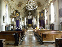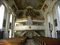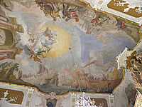 Die Innenausstattung, die sich schon mehr dem Rokoko zuwendet, ist geprägt von der Handschrift des berühmten Stuckateur und Malers Johann Baptist Zimmermann, der mit seinen Helfern und Söhnen auch das 200 qm große Deckengemälde der "Schlacht von Lepanto" meisterhaft in Freskentechnik schuf. Der Sieg dieser gewaltigen Seeschlacht über die Türken geht auf ein Rosenkranzwunder zurück.