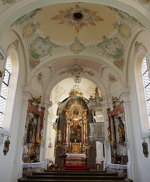 Die Kirche ist im Innenraum ein höchst beeindruckendes, hochkünstlerisches Gefüge. Das Langhaus besteht aus drei gekuppelten, von Gurtbögen getrennten Jochen, der Chorraum aus einem größeren Kuppelraum. Der Raum ist in sehr aufwendiger Weise im Stile des Rokoko ausstuckiert. Aus Stuck bestehen auch die Seitenaltäre, die Kanzel, der Hochaltarstirpes und die Emporenbrüstung.